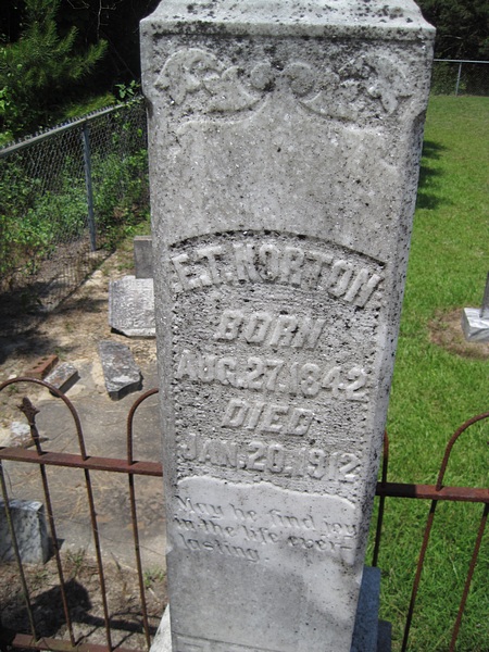 Elbert Theophilus Norton (1842-1912) was born on his father’s plantation, “Pleasant Plains”, in Barbour County, Alabama. This was a relatively modest cotton plantation, similar to the Searcy one in neighboring Henry County. In 1860 it included a dozen slaves. He was one of seventeen children of John and Nancy Norton. Usually he went by “El” or “E.T.”, although in the family he was sometimes called “Theo.”