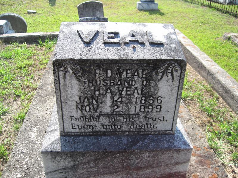 Francis DeKalb Veal (1836-1899) was born on his father’s farm in DeKalb County, Georgia, virtually in the shadow of Stone Mountain near Atlanta, which is today a memorial to those who served in the Confederate Army. There were many Veals in DeKalb County, all related and all farmers. In fact, the Veals were influential in naming the County for “the Baron de Kalb,” who died following the Battle of Camden, 1780, in the arms of a cousin. Colonel Edward Veal. Francis’ father, William, owned and operated a successful farm, but he used free labor and he owned no slaves. He was not a cotton planter.